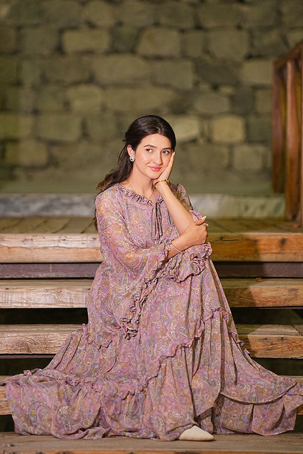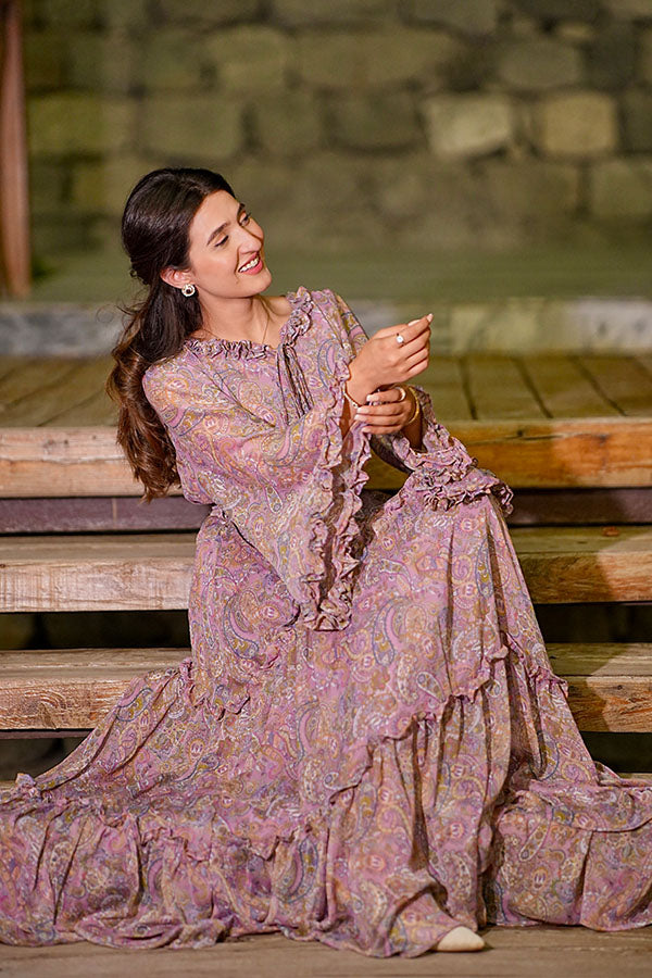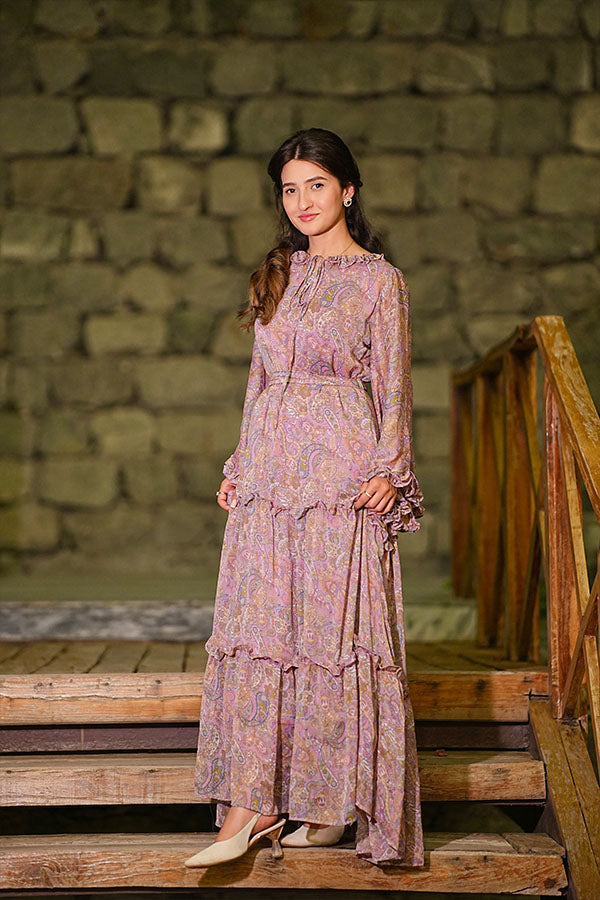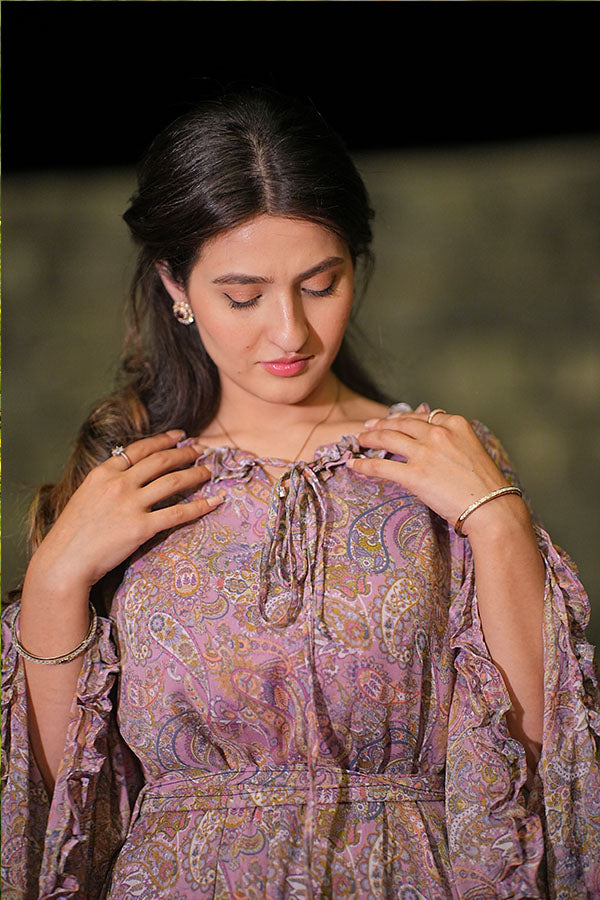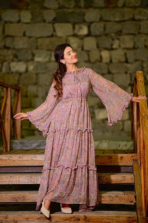 Embrace ethereal elegance! This lilac dress is a vision of romance, featuring a stunning print, tiered layers of frills, and statement bell sleeves. The neckline is adorned with delicate frills and a charming rope tie, while a delicate belt cinches the waist for a flattering silhouette. Perfect for special occasions or adding a touch of whimsy to your wardrobe. Shop now and make a statement!
