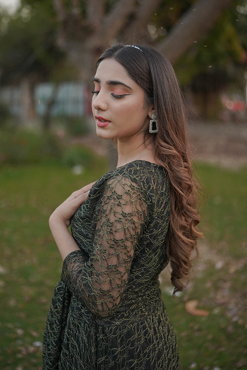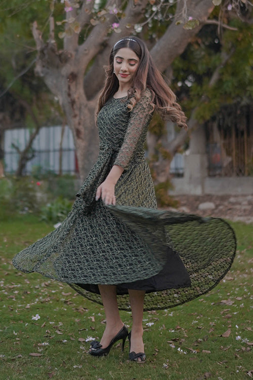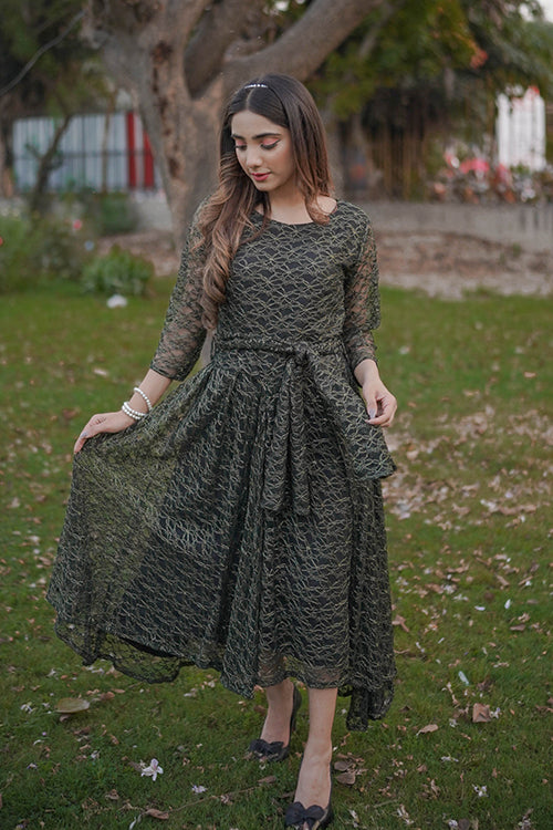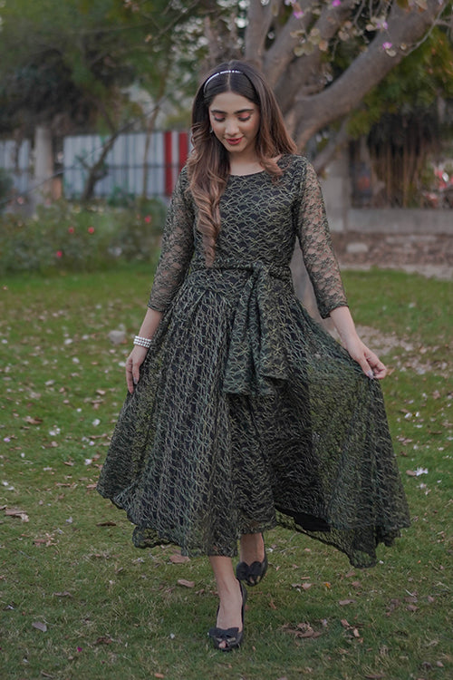 embroidered Net, Round -neckline with belt on waist & quater sleeves.
