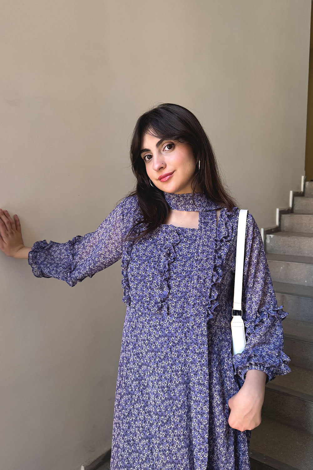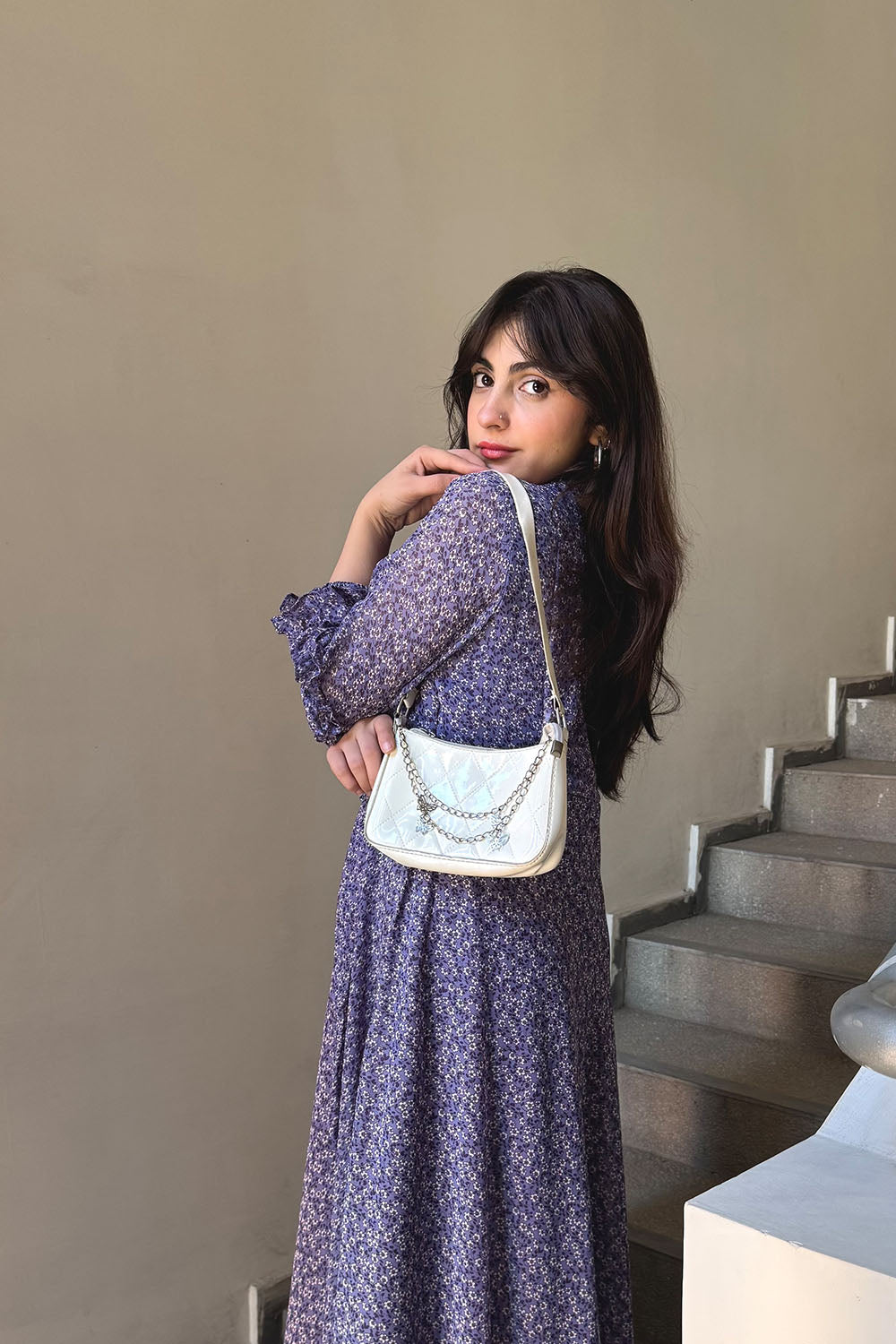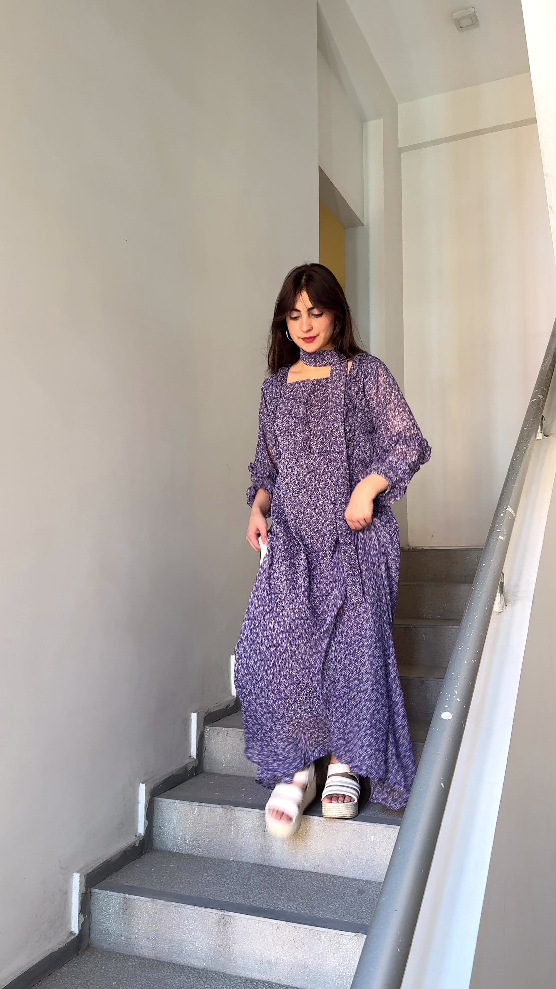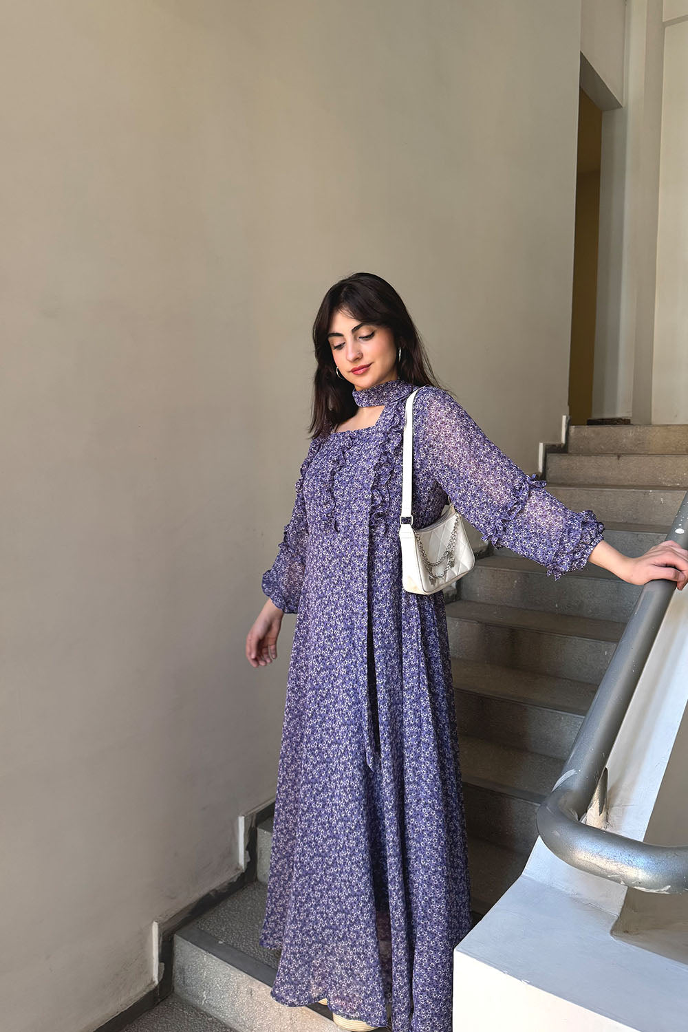 This enchanting floral dress is far from ordinary. It combines rich, moody purple hues with delicate feminine details that make a statement in any crowd. The dress features intricate ruffles framing the bodice, adding texture and a touch of Victorian charm. The long, airy sleeves boast elasticated ruffled cuffs, creating a beautiful, voluminous silhouette. A stunning floral pattern in shades of lavender and white against a deep amethyst backdrop adds a romantic touch, while the full-length skirt provides elegant coverage and a dramatic swish with every step.