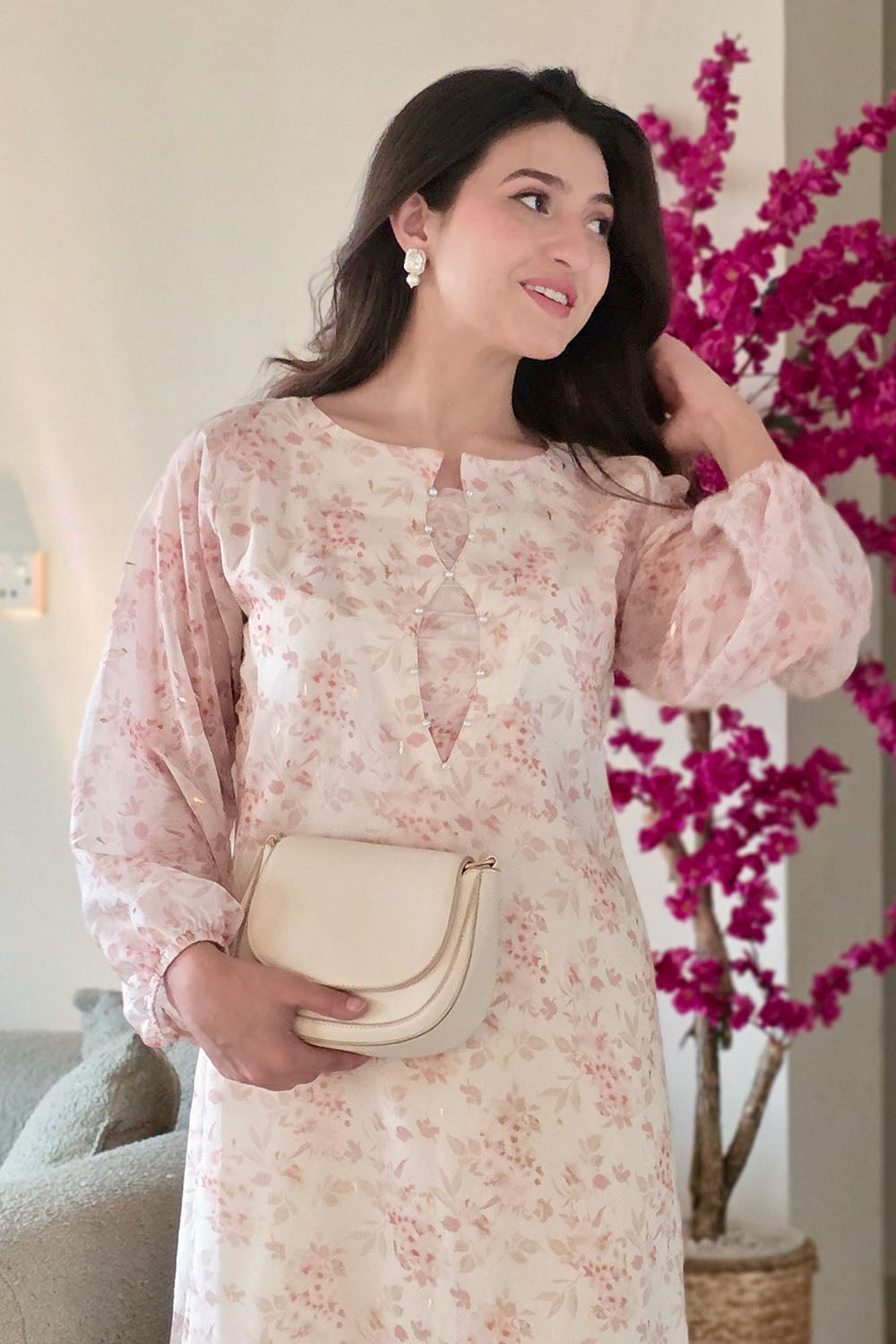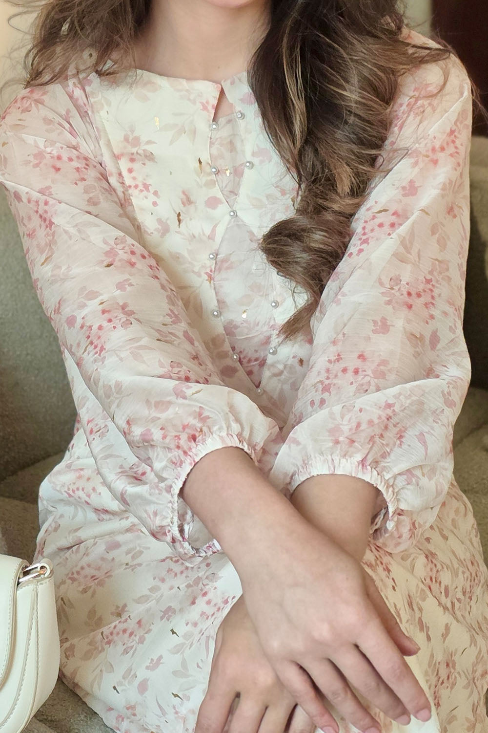 Elegant and effortless! This kaftan-style shirt in premium silky chiffon is a dream. Featuring stunning gold detailing, long sleeves with elastic cuffs, and delicate pearl accents on the neckline. A perfect statement piece. Perfect for iftar party in Ramadan and on Eid too.