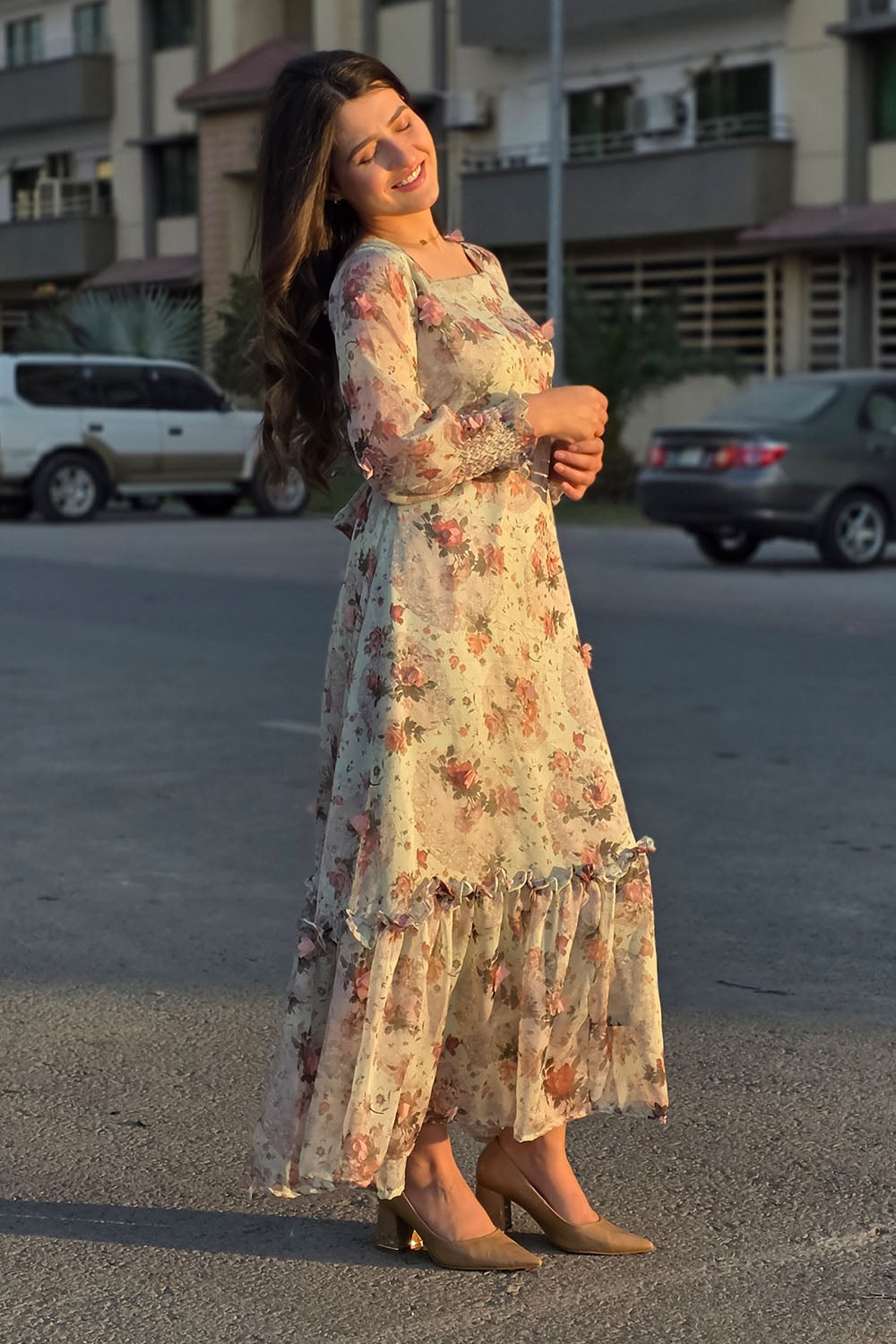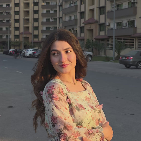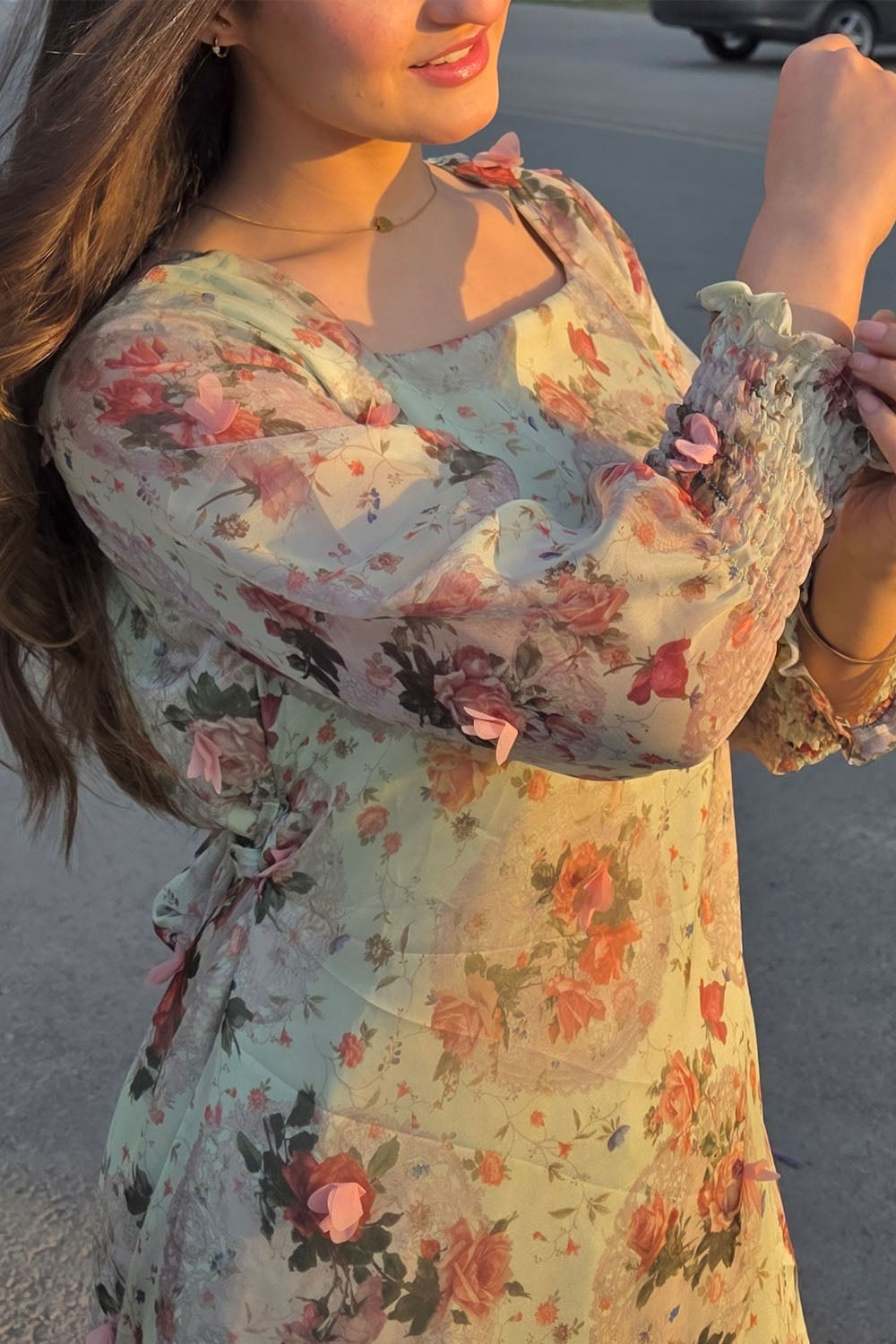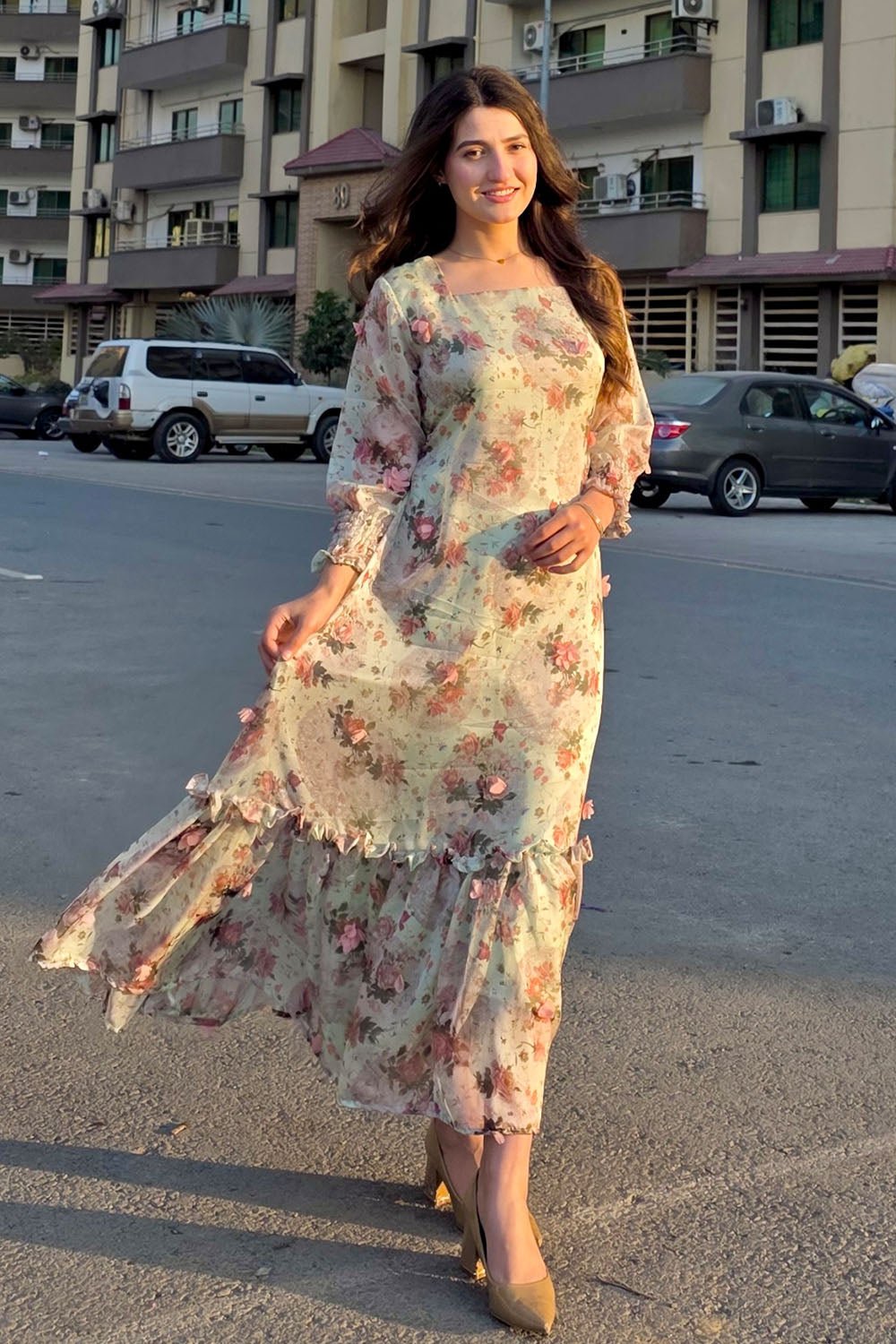 Spring has sprung! This stunning pistachio green dress features a luxurious 3D fabric with delicate pink 3D flowers and a unique print. The design includes a flattering belt, a single-tiered hem, a chic square neckline, and full sleeves with stylish smocked cuffs. A perfect outfit for the season.
