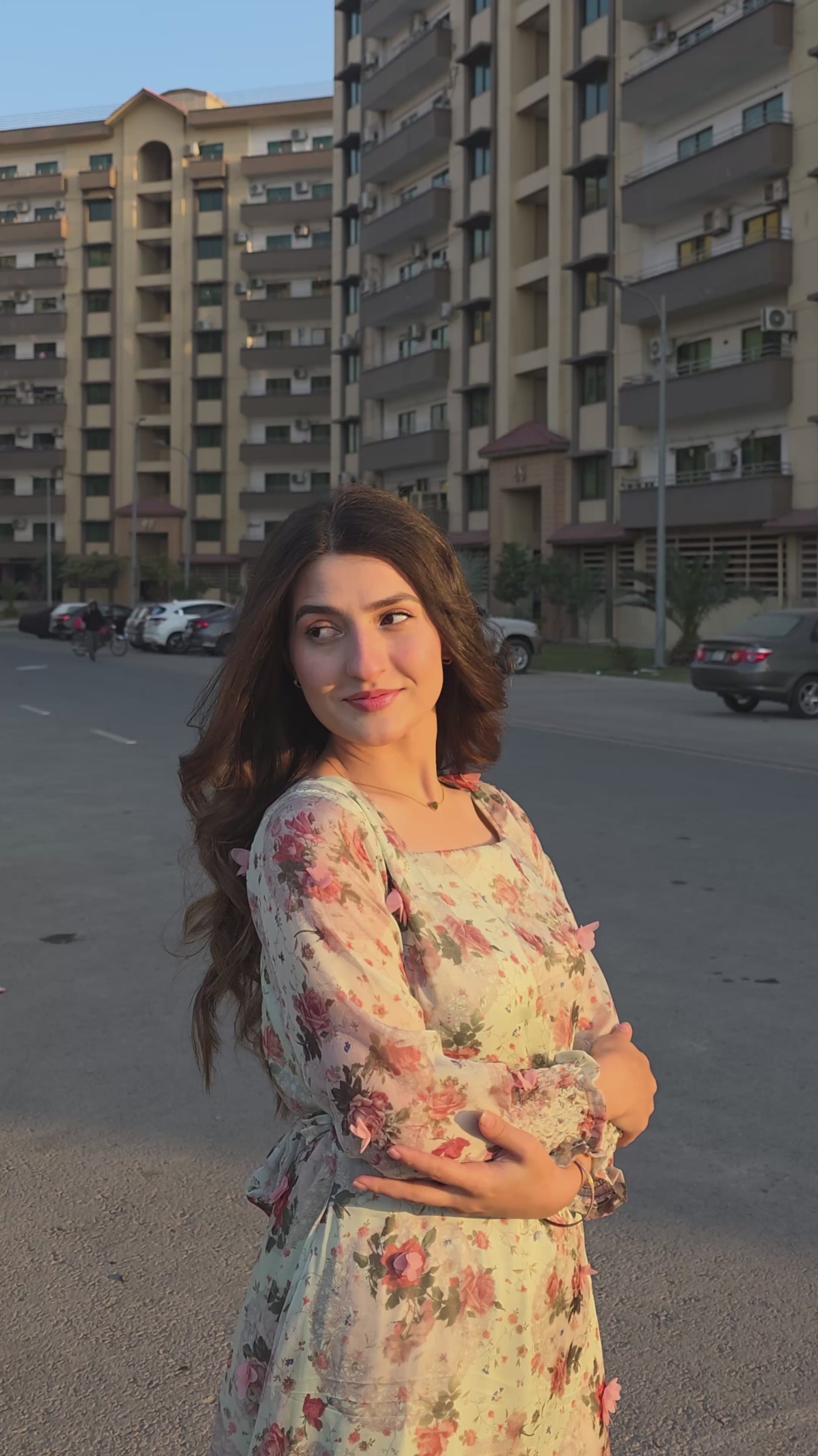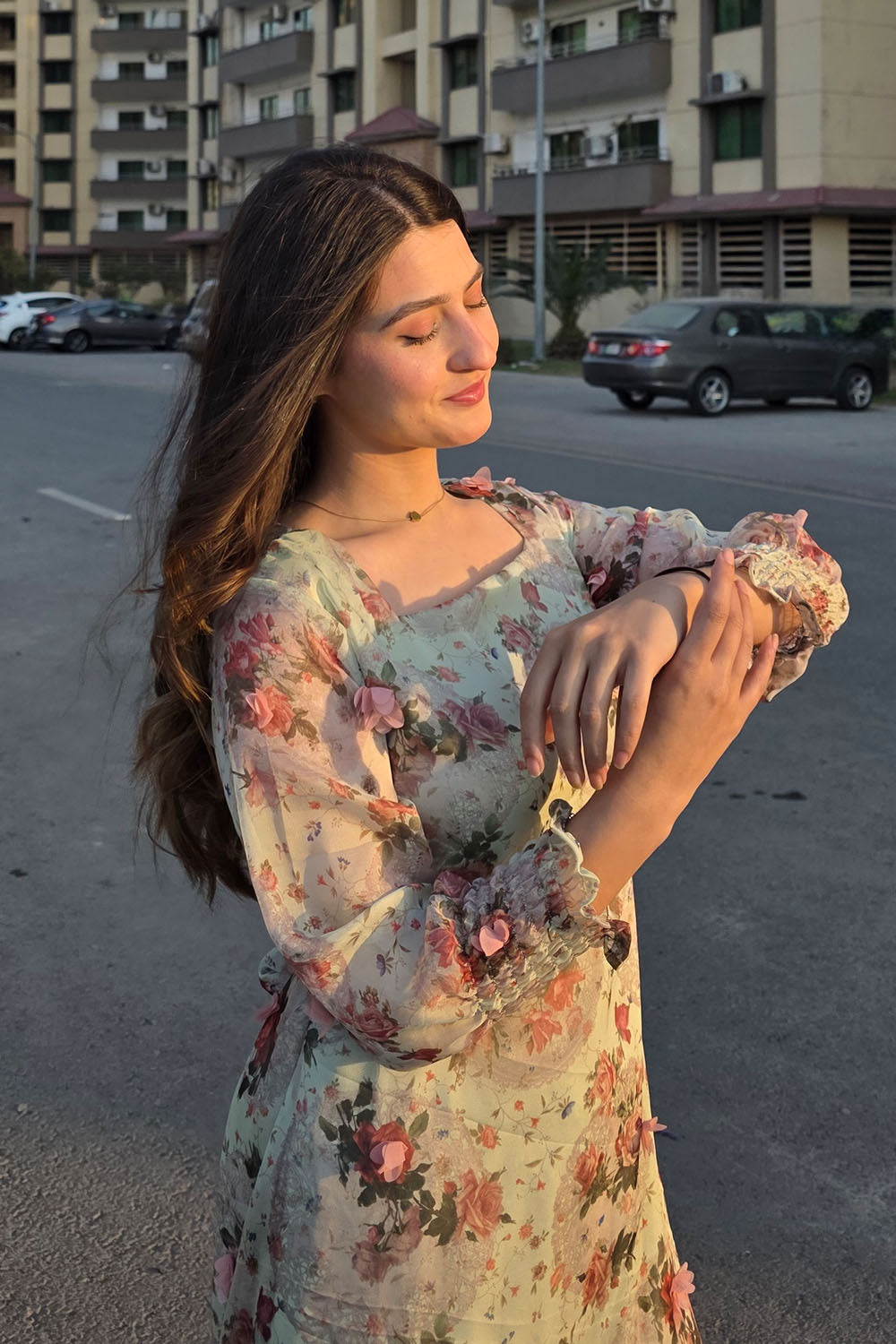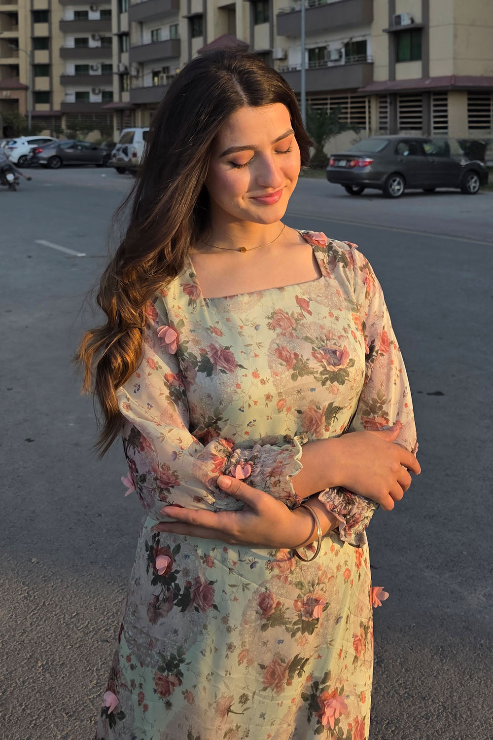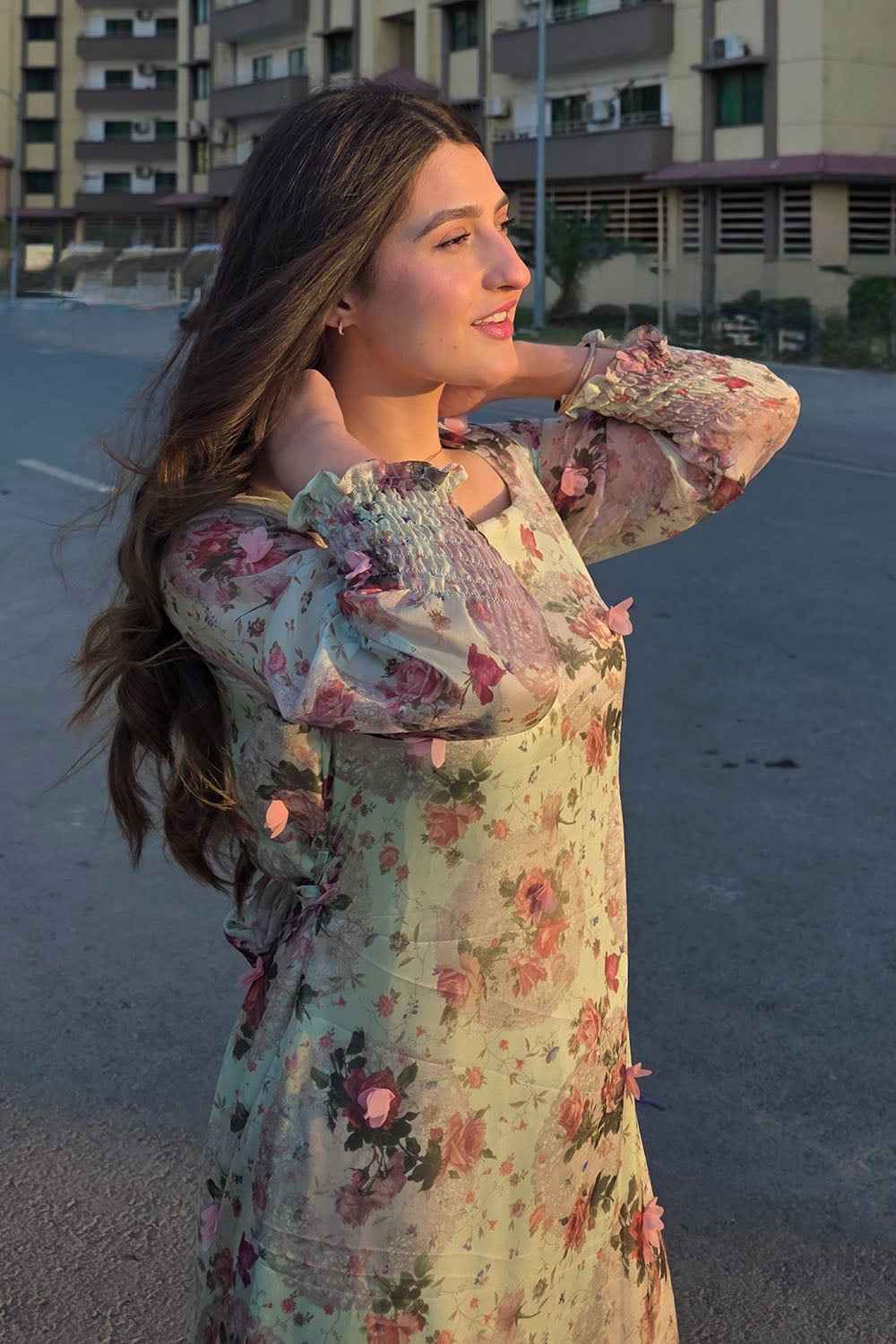 Spring has sprung! This stunning pistachio green dress features a luxurious 3D fabric with delicate pink 3D flowers and a unique print. The design includes a flattering belt, a single-tiered hem, a chic square neckline, and full sleeves with stylish smocked cuffs. A perfect outfit for the season.
