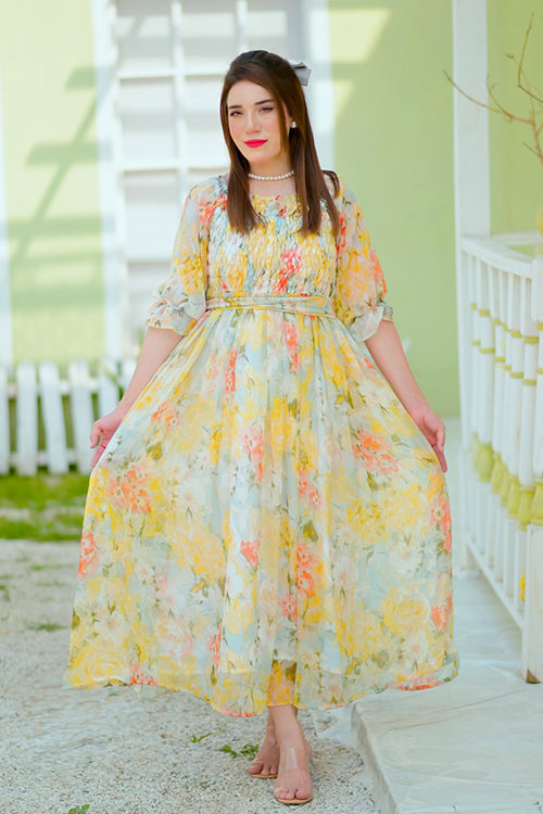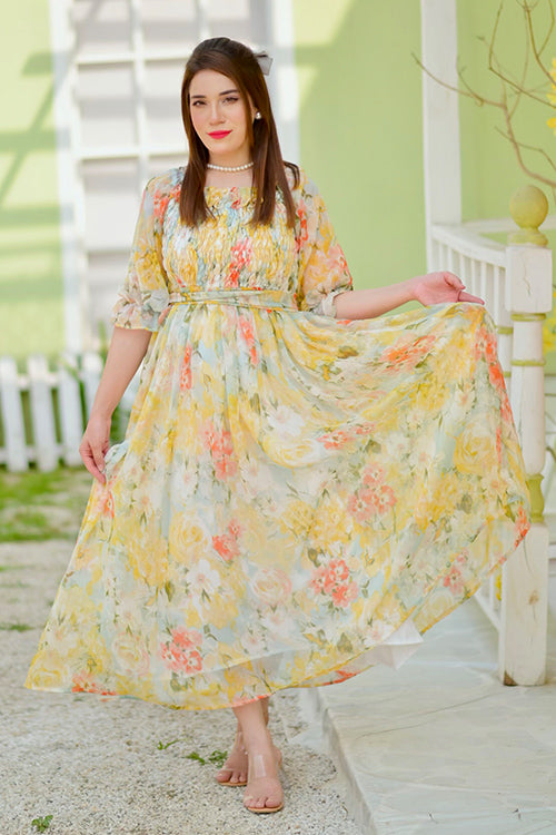 Smocked bodice, frilled square neckline, three quarter sleeves and single flare.